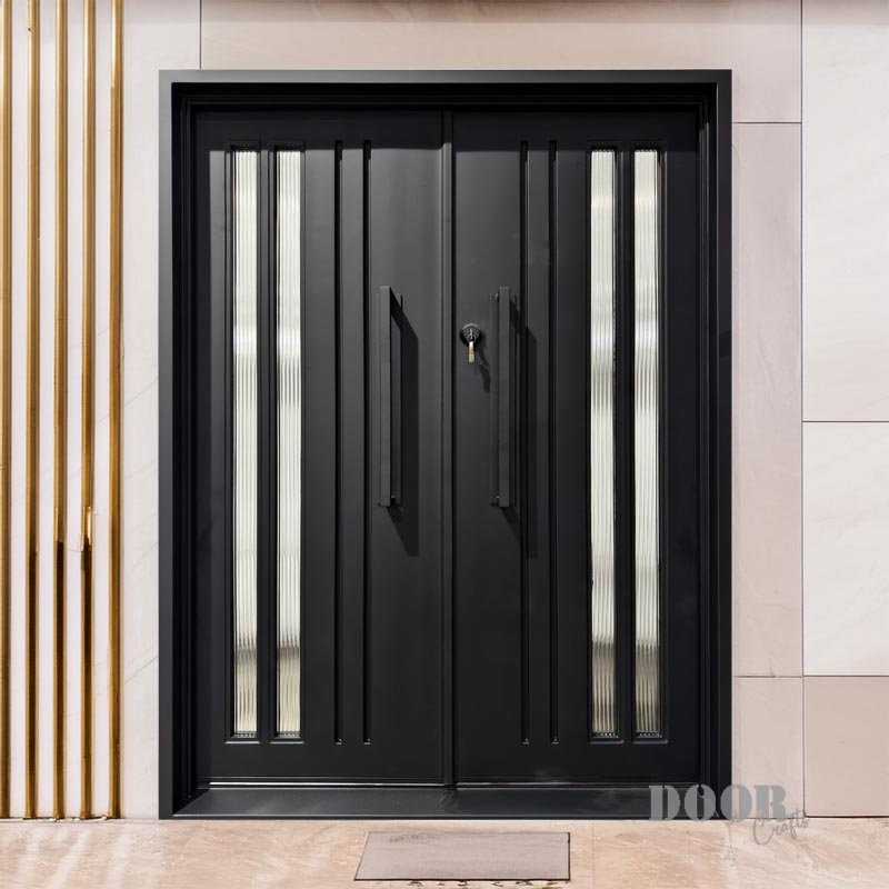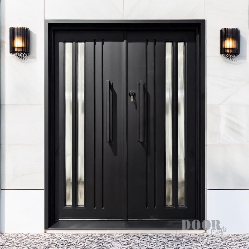 Double-panel metal doors are engineered to add beauty and security in high-traffic settings. These doors are easily adjustable and have reeded glass glass fixed vertically in a linear pattern within the frame. They are easily adjustable with dimensions of 61 x 81. Including handle, pre installed deadbolt, and sales tax. Including handle, pre installed deadbolt, and sales tax.