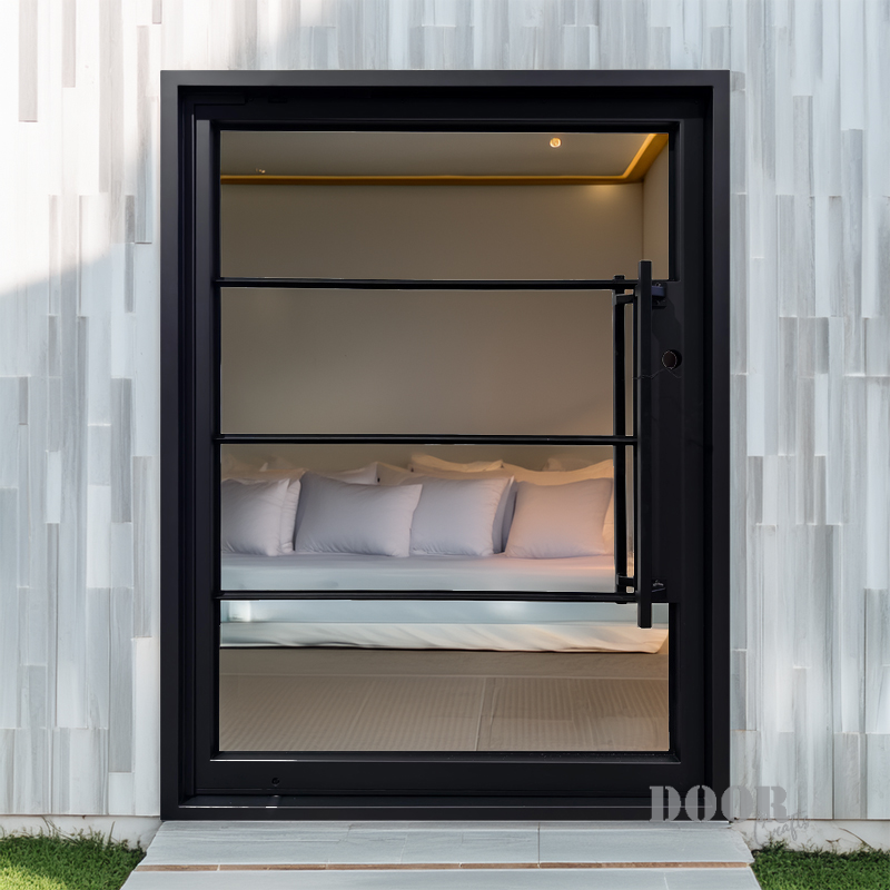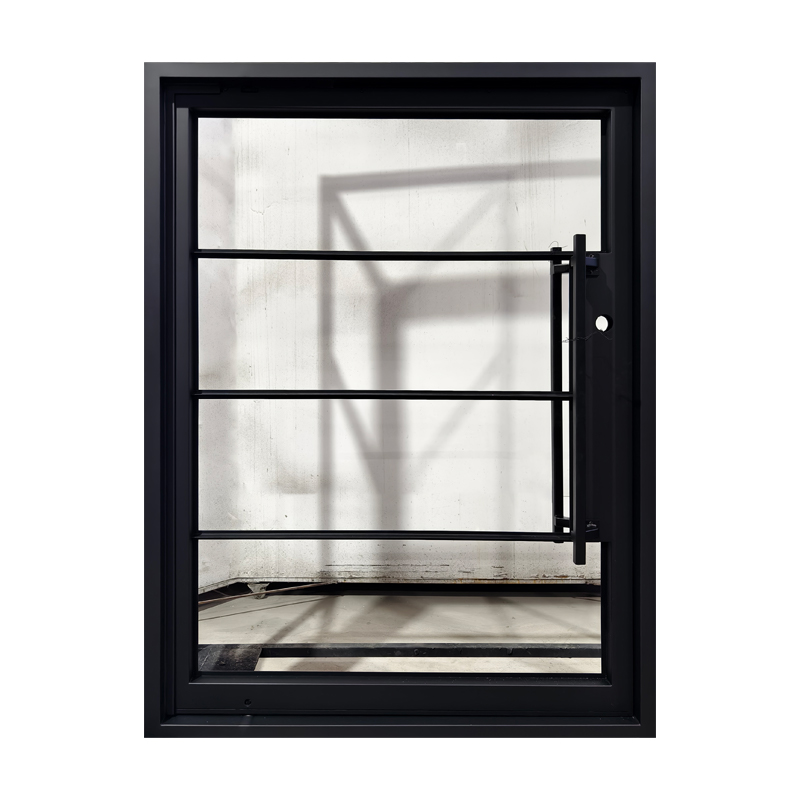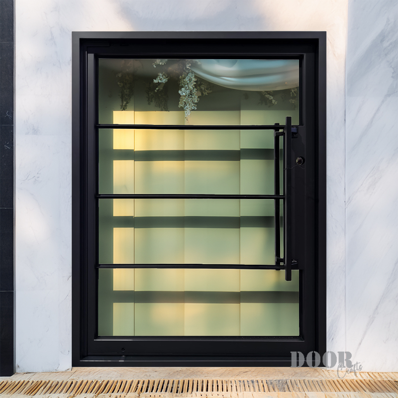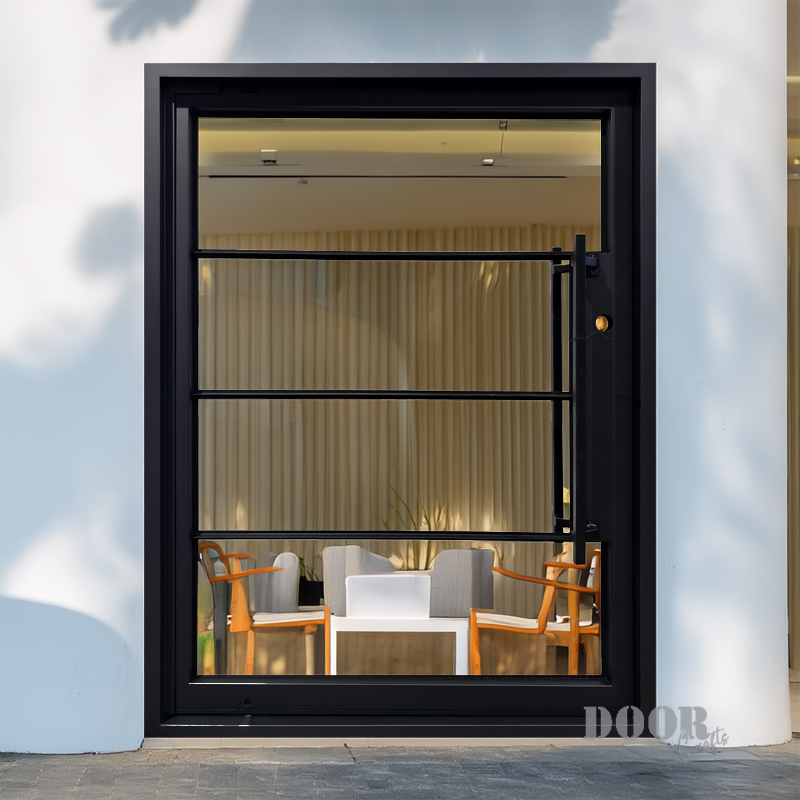 Featuring a flat black finish and four evenly spaced horizontal glass panels, The Modern 4-Lite Pivot door balances transparency with clean, modern lines. The minimalist handle enhances its streamlined silhouette, creating a door that’s both functional and architecturally striking. Ideal for contemporary spaces, it offers a refined blend of light, form, and sophistication.