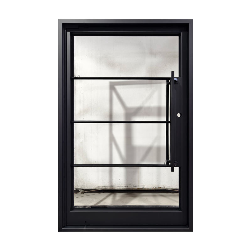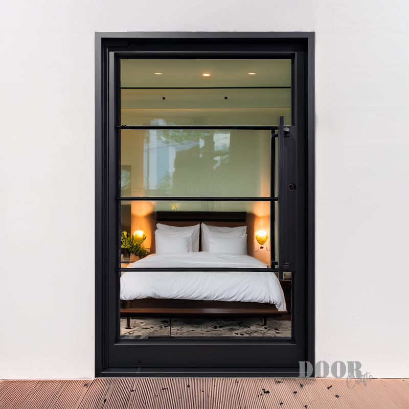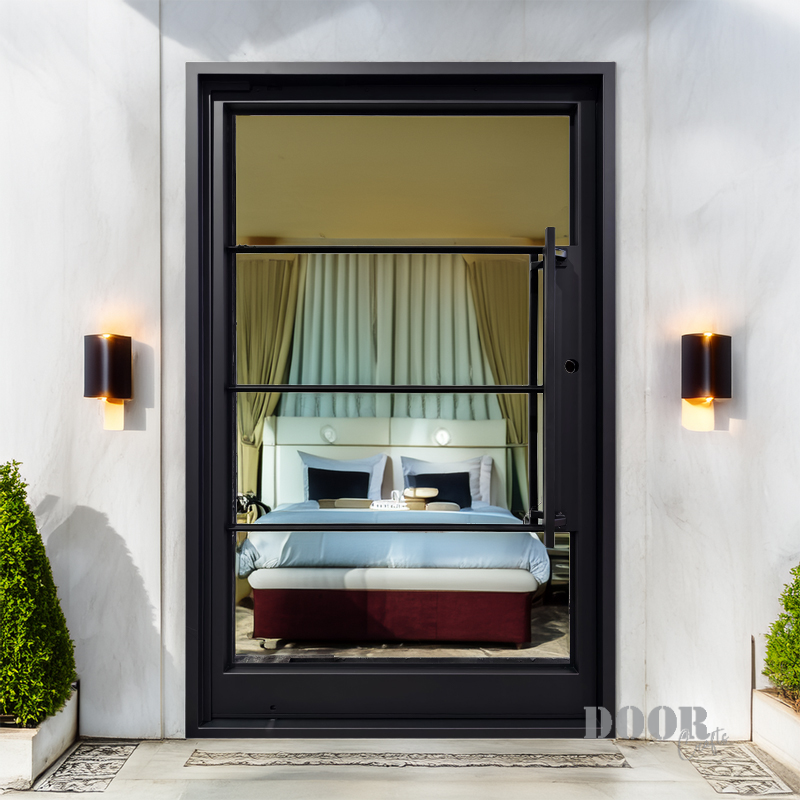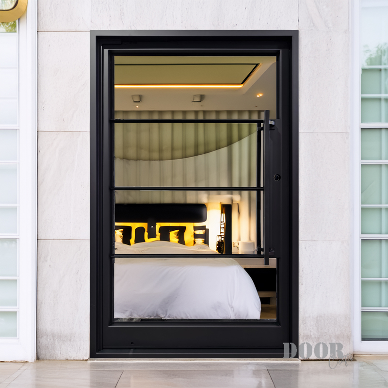 Featuring a flat black finish and four evenly spaced horizontal glass panels, The Modern 4-Lite Pivot door balances transparency with clean, modern lines. The minimalist handle enhances its streamlined silhouette, creating a door that’s both functional and architecturally striking. Ideal for contemporary spaces, it offers a refined blend of light, form, and sophistication.