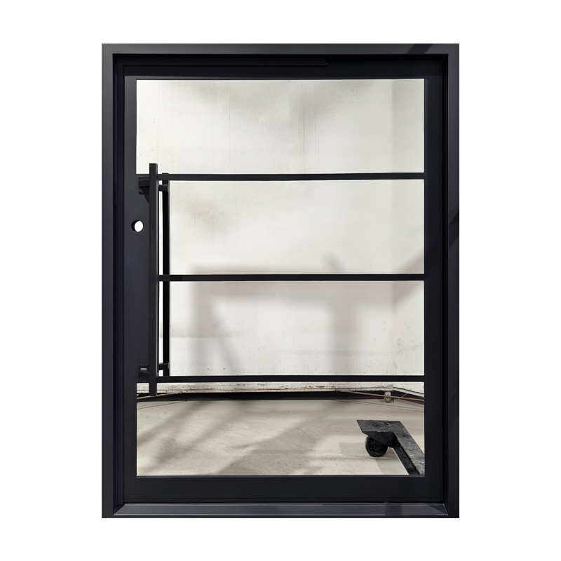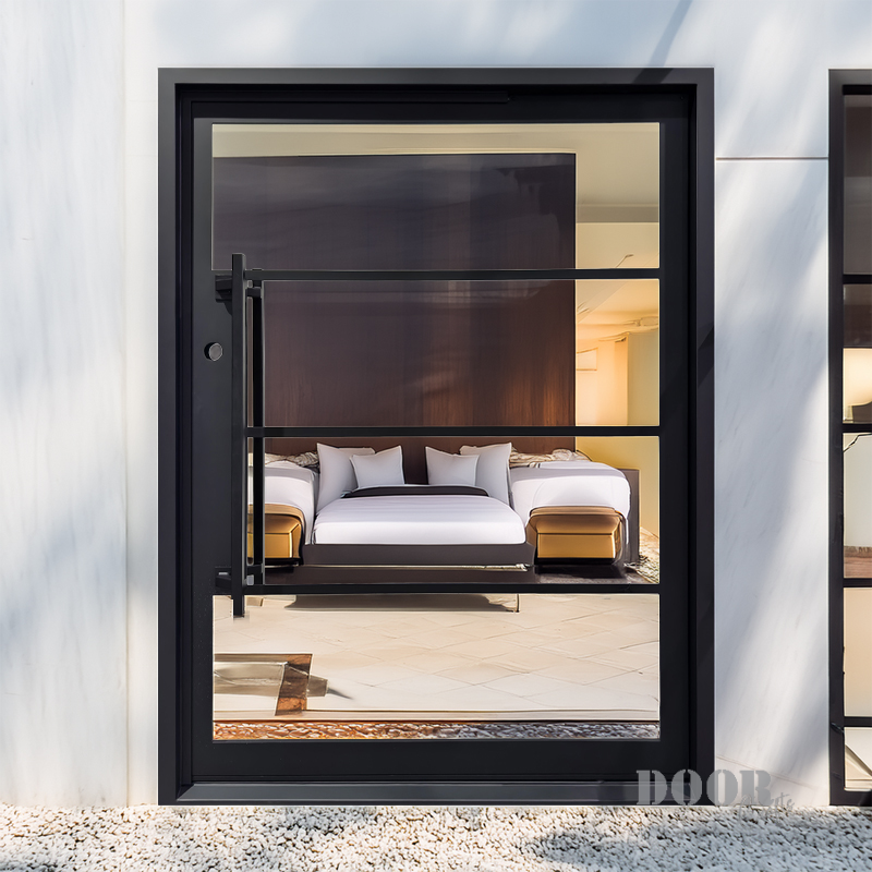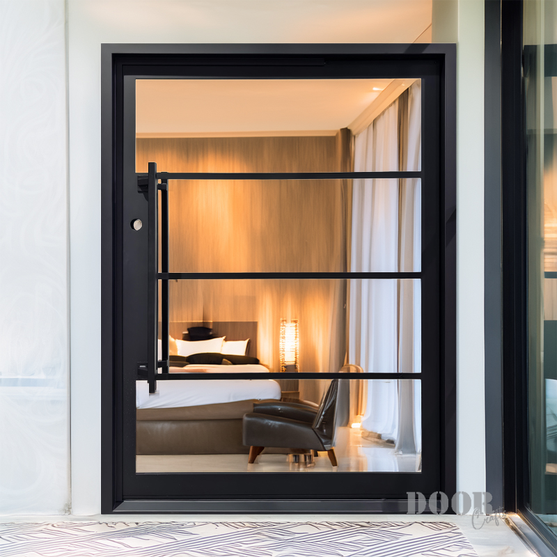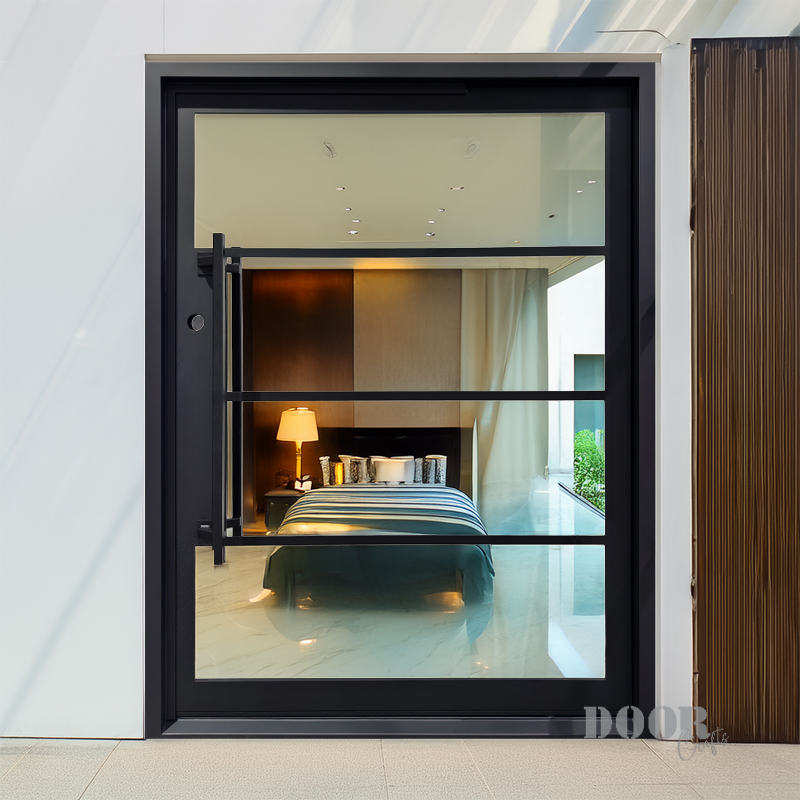 Featuring a flat black finish and four evenly spaced horizontal glass panels, The Modern 4-Lite Pivot door balances transparency with clean, modern lines. The minimalist handle enhances its streamlined silhouette, creating a door that’s both functional and architecturally striking. Ideal for contemporary spaces, it offers a refined blend of light, form, and sophistication.
