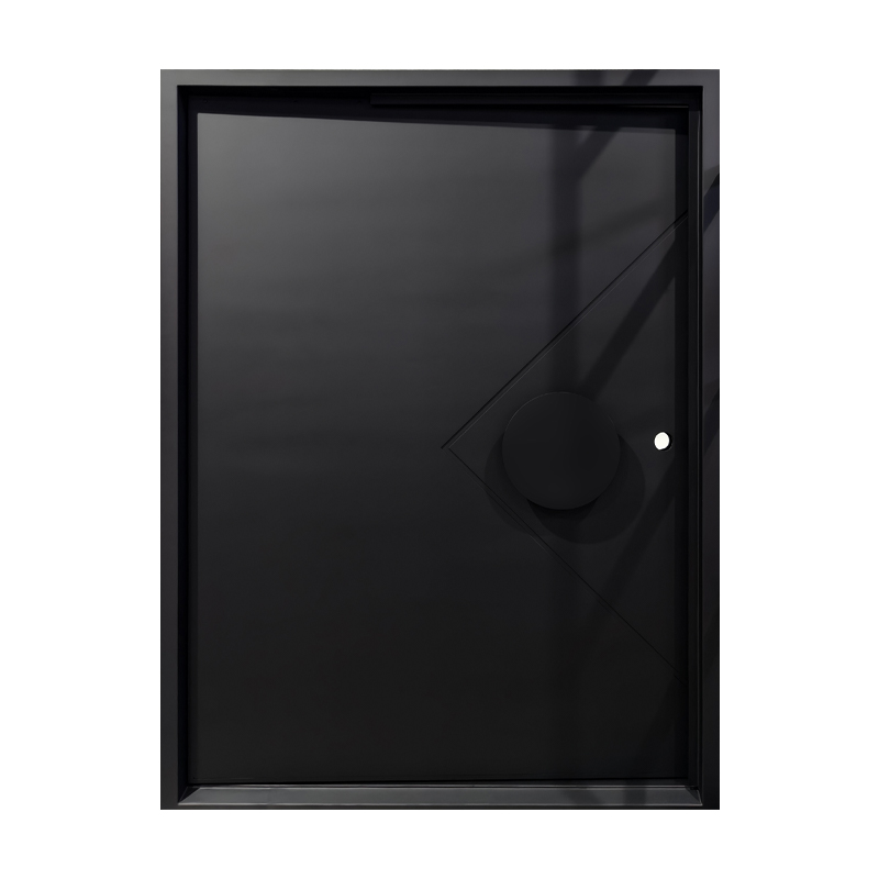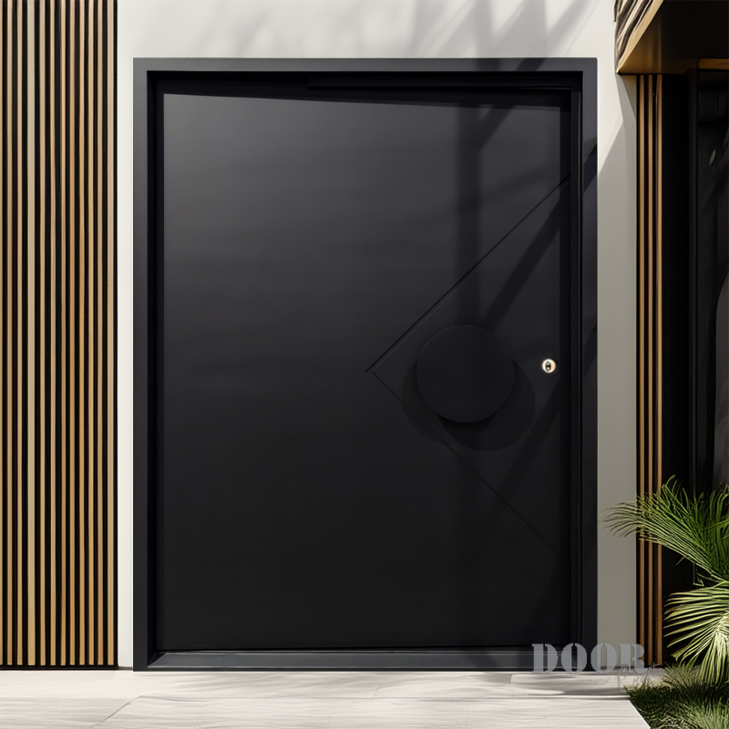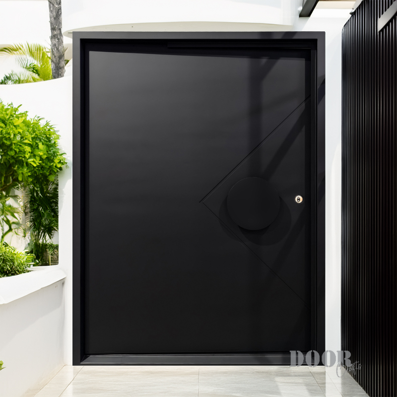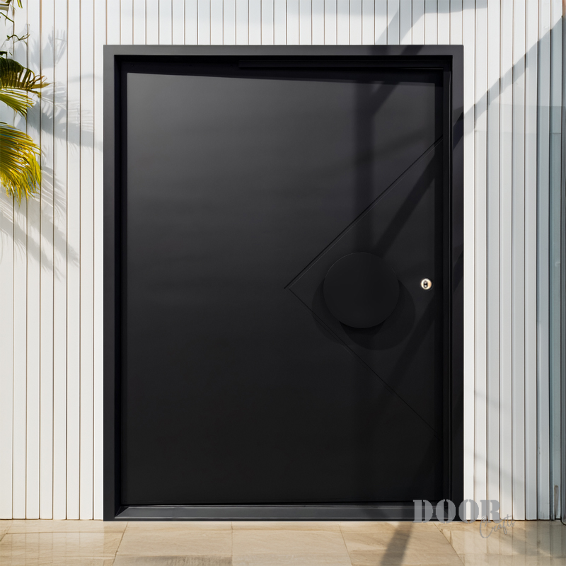The Axis Pivot door features a distinctive recessed line pattern that adds depth and texture to its sleek surface. Paired with a smooth, circular handle, it creates a balanced interplay of geometric detail and minimalist form. Designed for contemporary spaces, this pivot door offers a striking yet refined entrance solution.