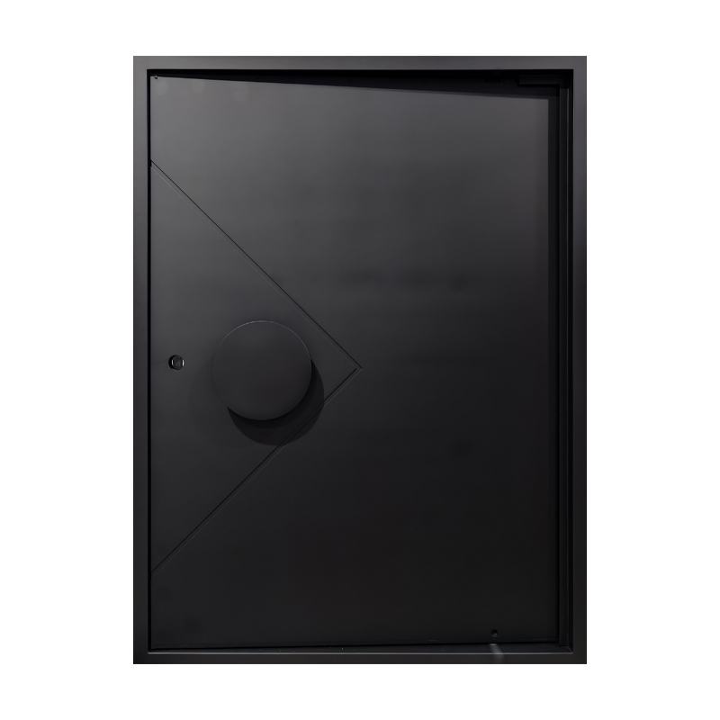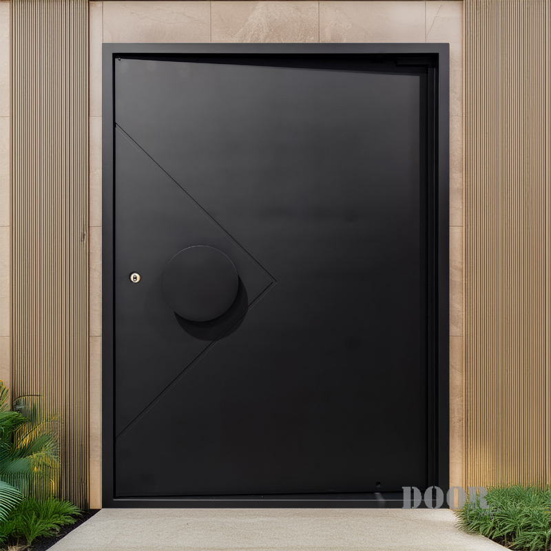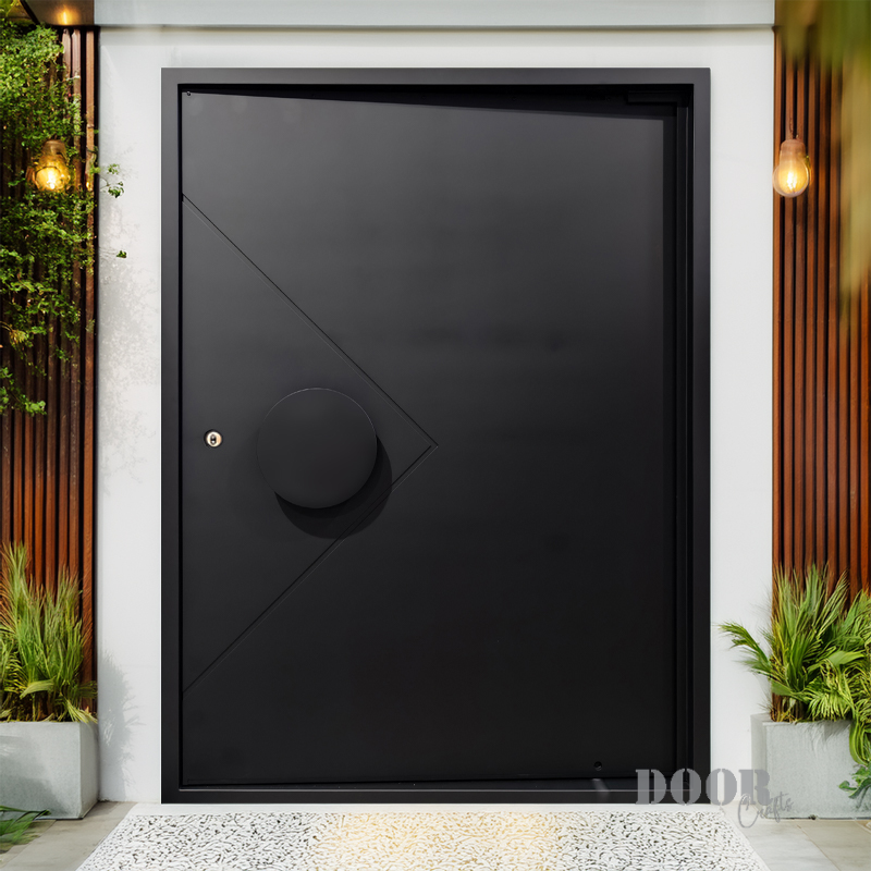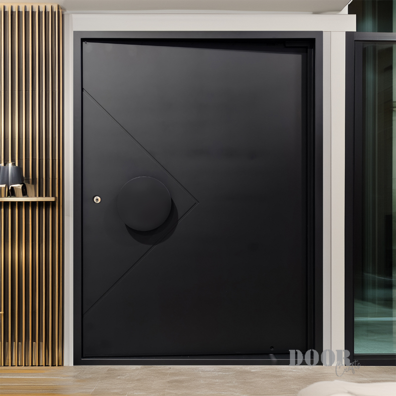 The Axis Pivot door features a distinctive recessed line pattern that adds depth and texture to its sleek surface. Paired with a smooth, circular handle, it creates a balanced interplay of geometric detail and minimalist form. Designed for contemporary spaces, this pivot door offers a striking yet refined entrance solution.