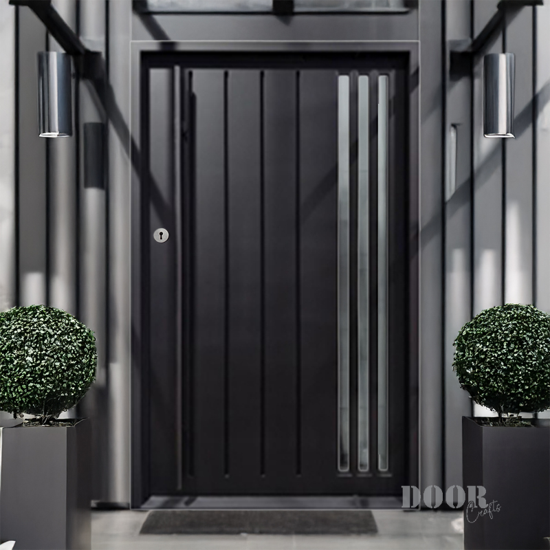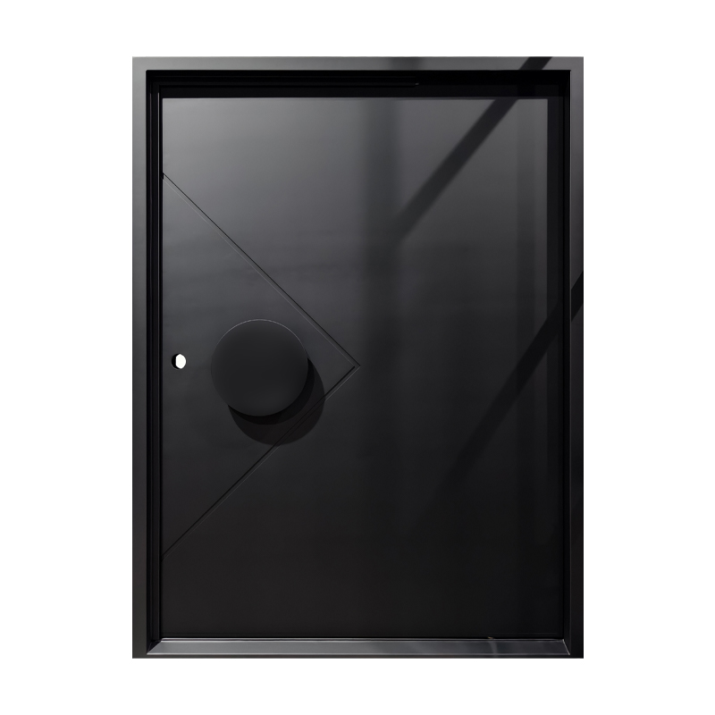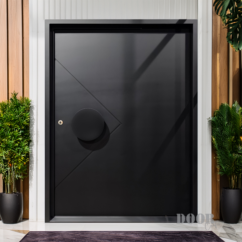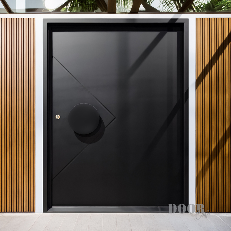 The Axis Pivot door features a distinctive recessed line pattern that adds depth and texture to its sleek surface. Paired with a smooth, circular handle, it creates a balanced interplay of geometric detail and minimalist form. Designed for contemporary spaces, this pivot door offers a striking yet refined entrance solution.
