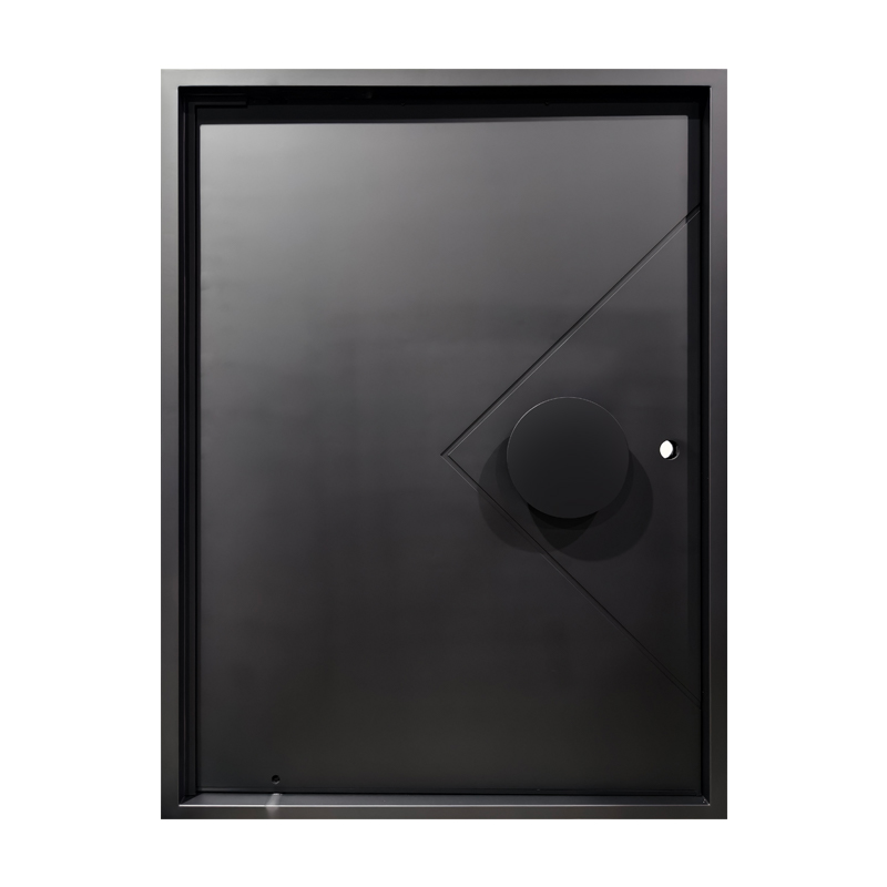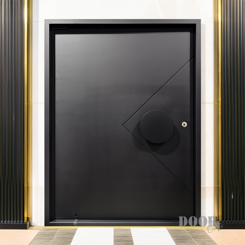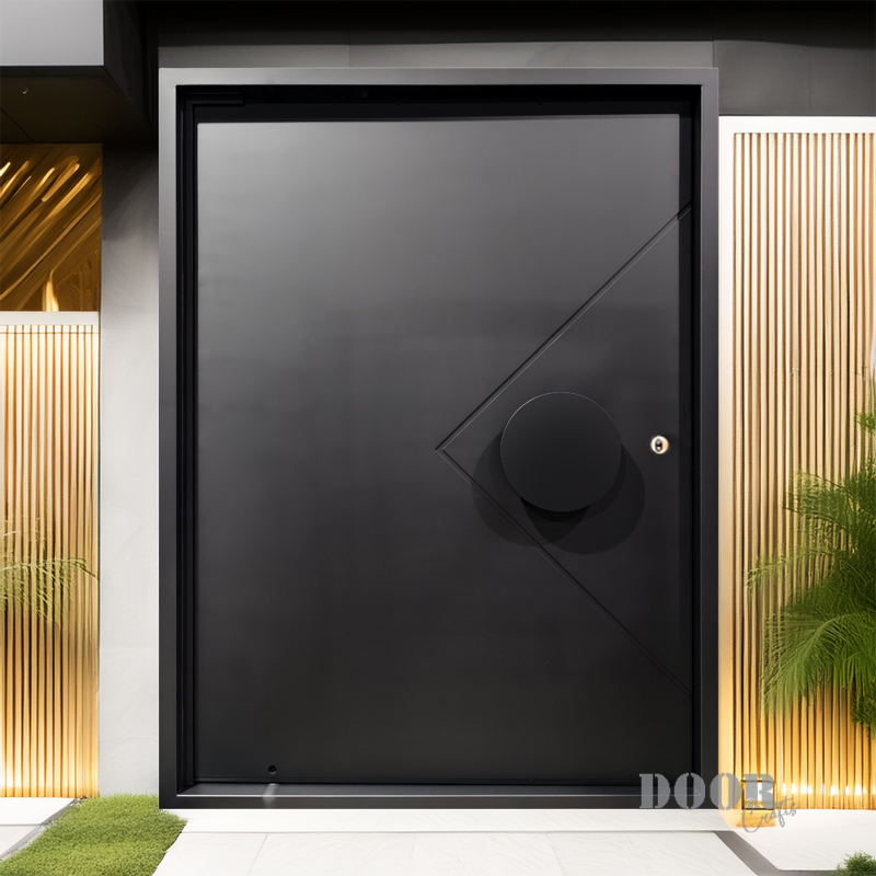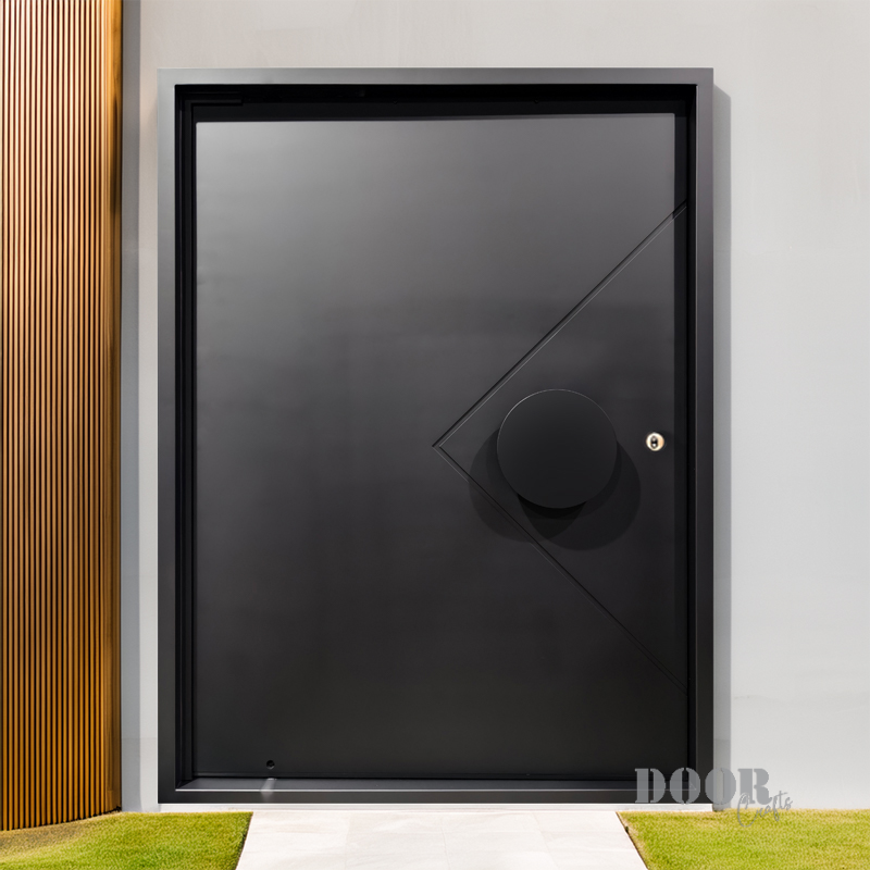 The Axis Pivot door features a distinctive recessed line pattern that adds depth and texture to its sleek surface. Paired with a smooth, circular handle, it creates a balanced interplay of geometric detail and minimalist form. Designed for contemporary spaces, this pivot door offers a striking yet refined entrance solution.