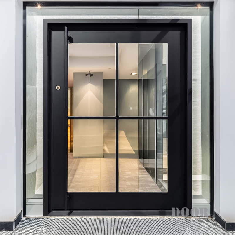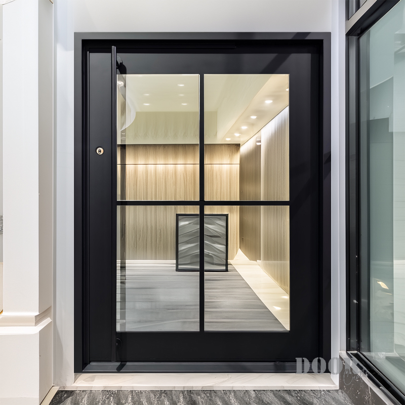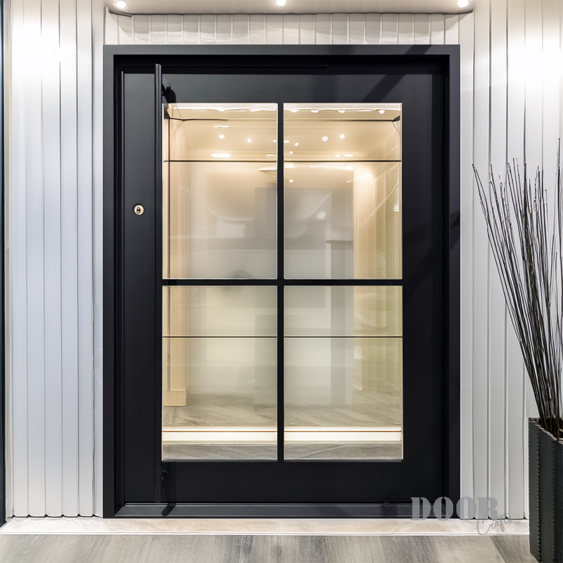 The Classic 4-Lite pivot door features four glass panels arranged in a clean grid, separated by slim mullions that emphasize structure and symmetry. Its balanced design combines transparency with defined framing, creating a timeless look that complements both modern and traditional settings. The door’s sleek finish and minimalist hardware complete an elegant, versatile entrance solution.