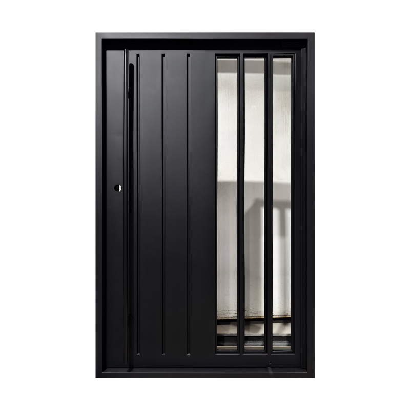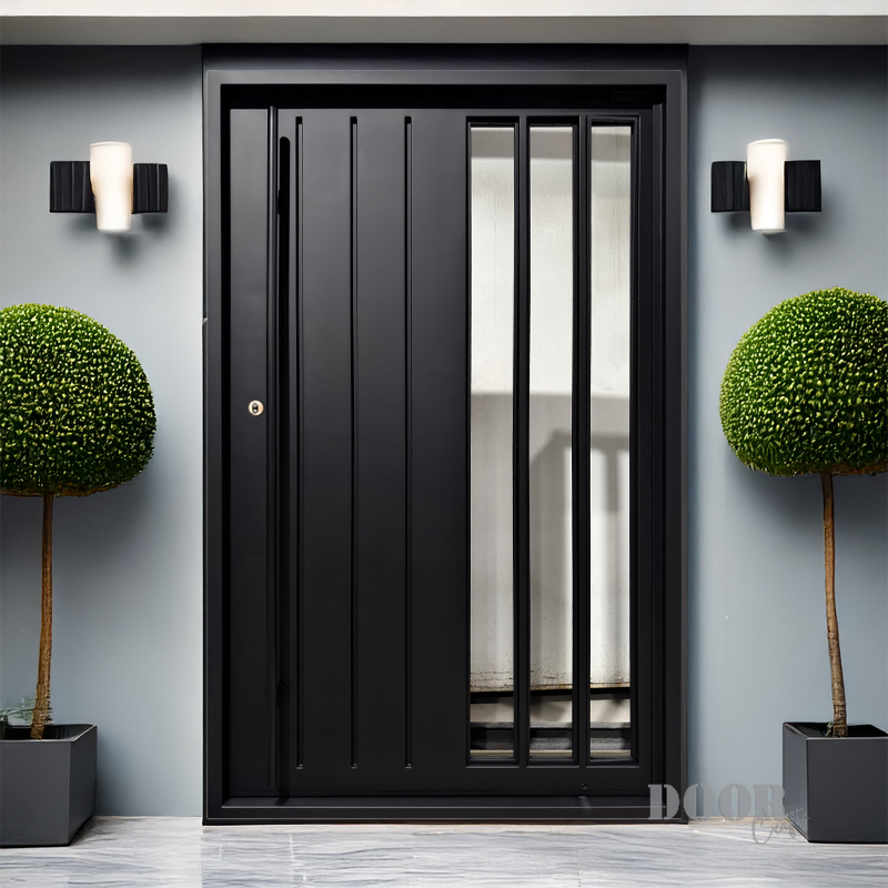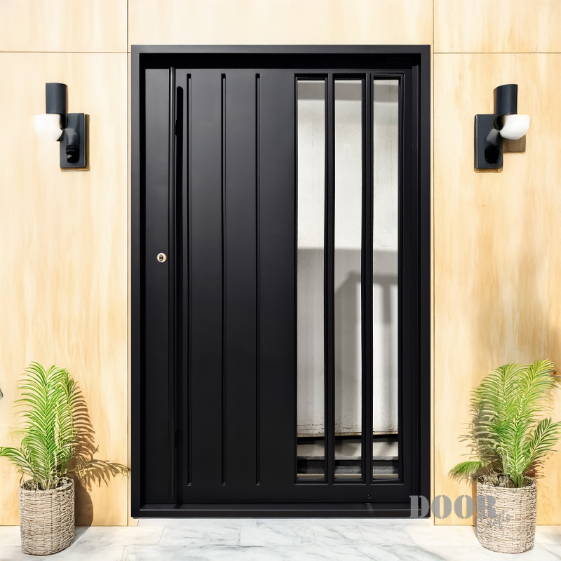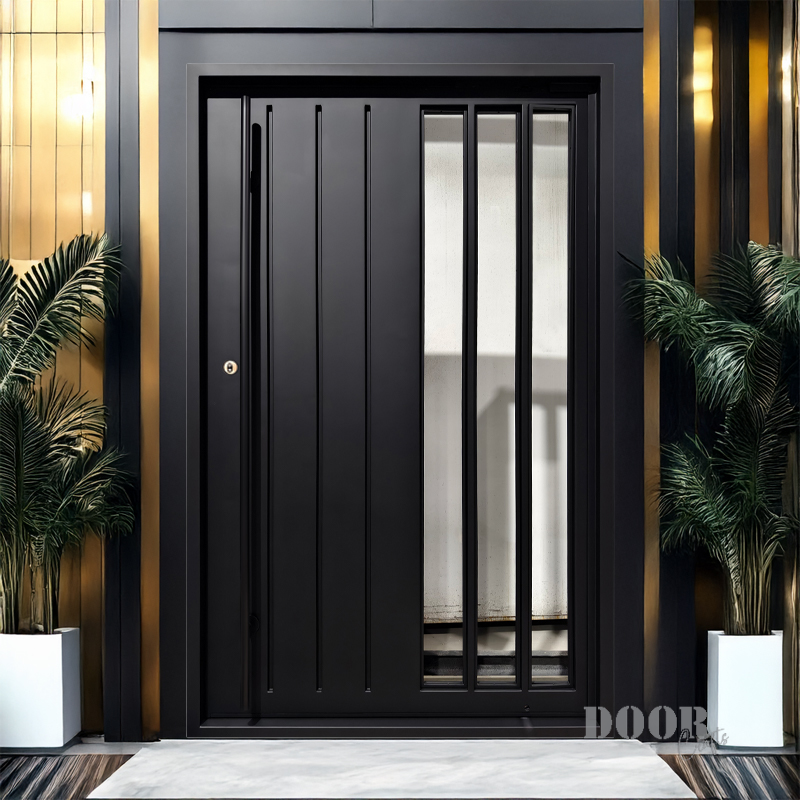 Defined by clean geometry and subtle contrast, The Sahara is a pivot door engineered for modern spaces. Its deep flat black surface provides a bold, monolithic look, disrupted only by three offset vertical glass inserts that introduce light and visual rhythm. The offset glazing is balanced by a slender, full-height handle, emphasizing verticality and seamless function. Designed to merge architectural precision with minimalist design language.