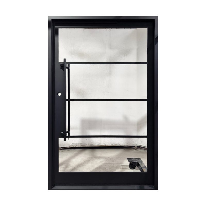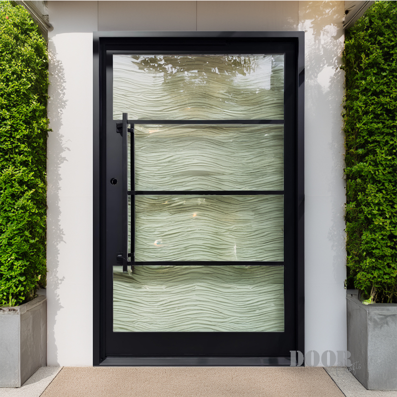 Featuring a flat black finish and four evenly spaced horizontal glass panels, The Modern 4-Lite Pivot door balances transparency with clean, modern lines. The minimalist handle enhances its streamlined silhouette, creating a door that’s both functional and architecturally striking. Ideal for contemporary spaces, it offers a refined blend of light, form, and sophistication.
