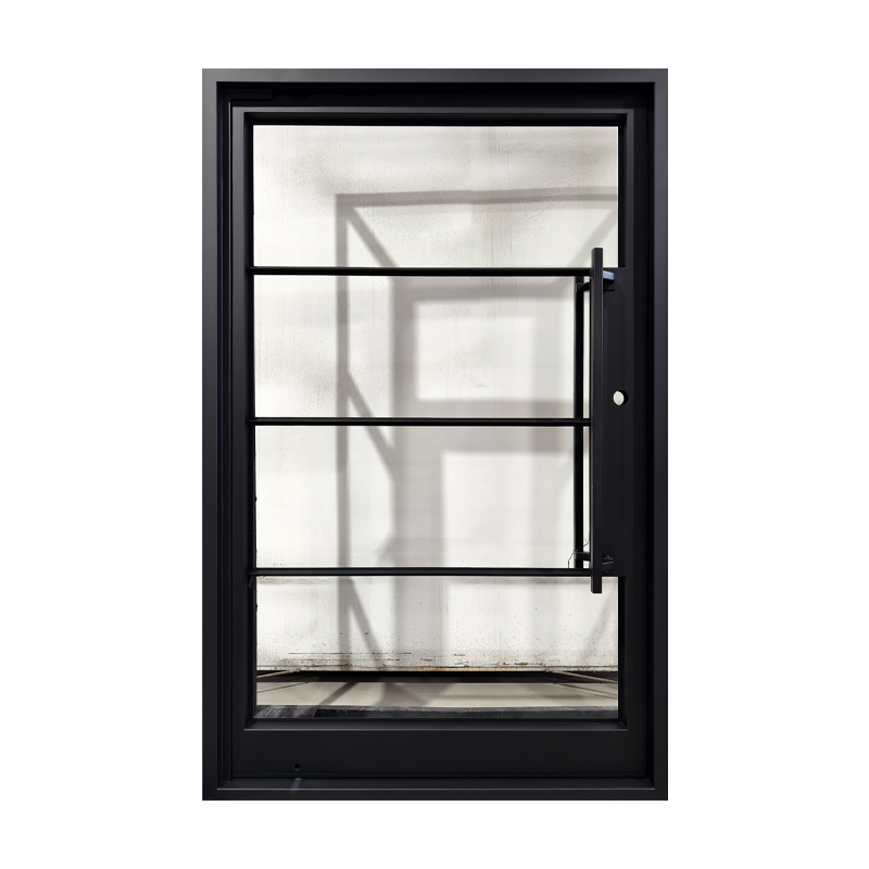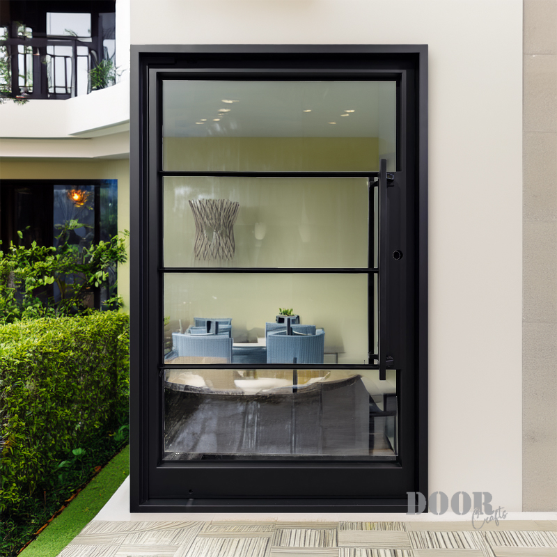 Featuring a flat black finish and four evenly spaced horizontal glass panels, The Modern 4-Lite Pivot door balances transparency with clean, modern lines. The minimalist handle enhances its streamlined silhouette, creating a door that’s both functional and architecturally striking. Ideal for contemporary spaces, it offers a refined blend of light, form, and sophistication.