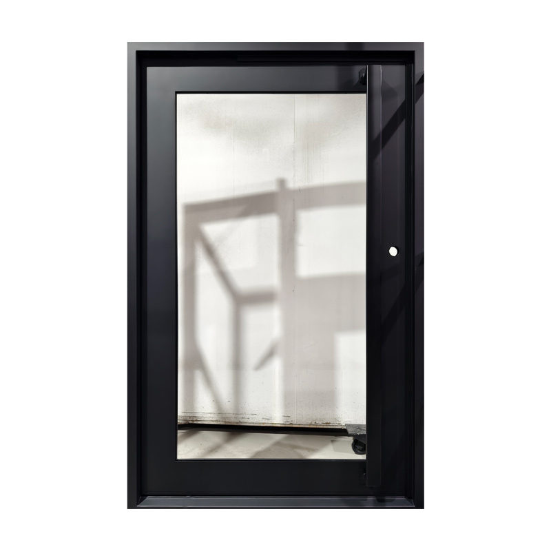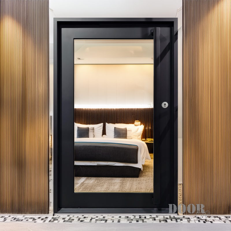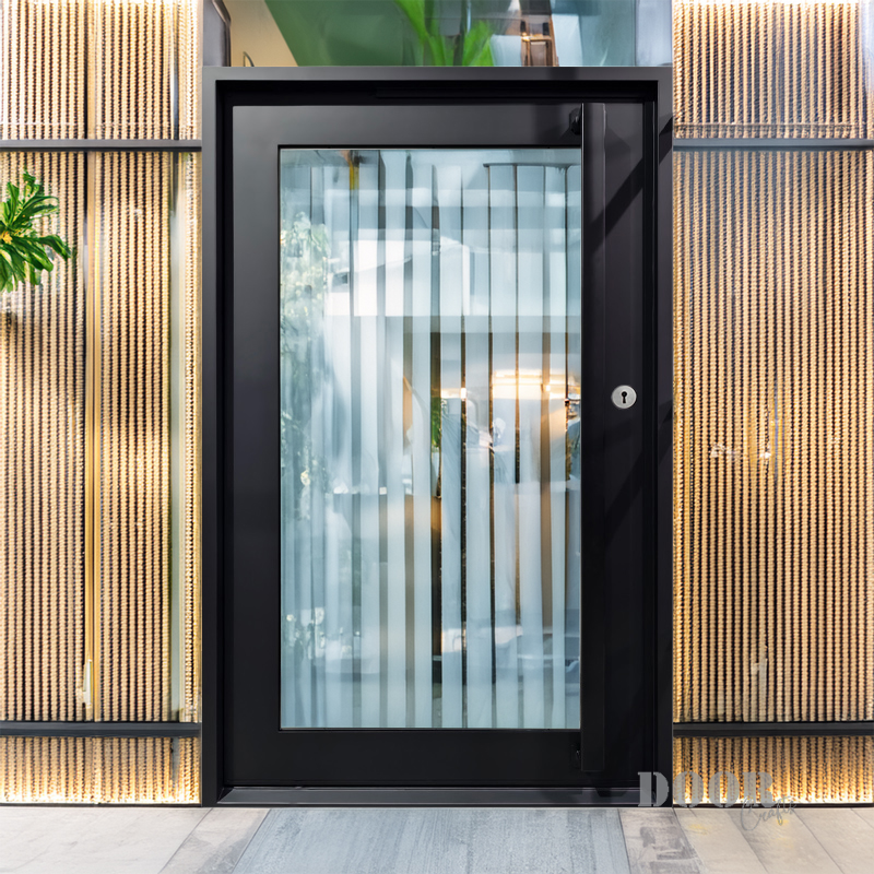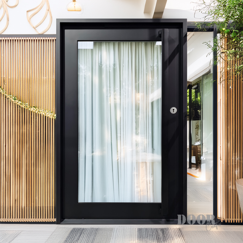The Peace Keeper features a single expansive glass panel designed to create a transparent, open connection between inside and out. Its reflective quality evokes a “if you can see me, I can see you” dynamic, blending privacy with awareness. This pivot door offers a minimalist, modern statement that invites light while encouraging thoughtful interaction with the surrounding environment.