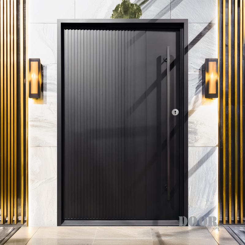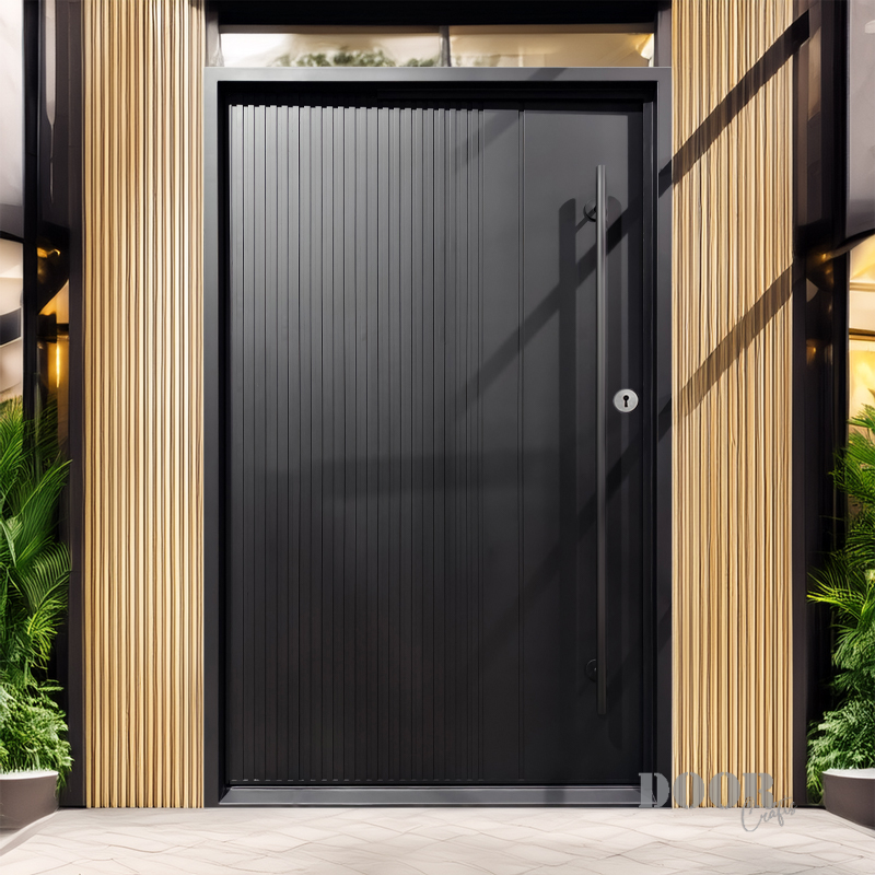 The Chevron pivot door showcases a sleek flat black finish detailed with vertical recessed lines that create a subtle, rhythmic texture. This design brings refined depth and modern sophistication to a minimalist silhouette, making it an elegant focal point for contemporary interiors.