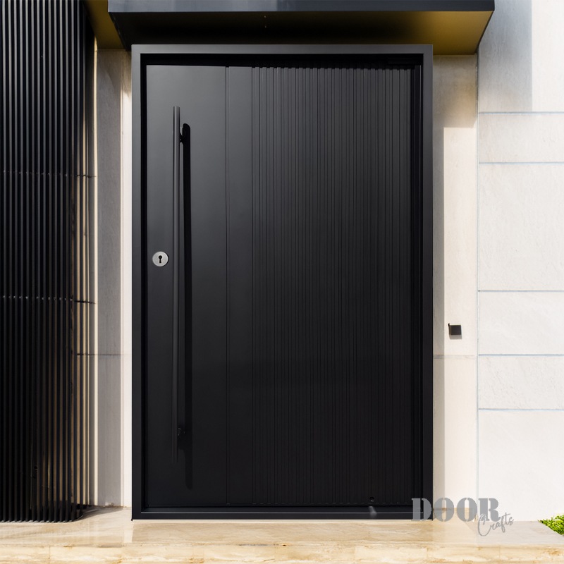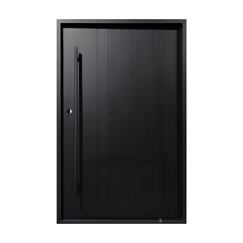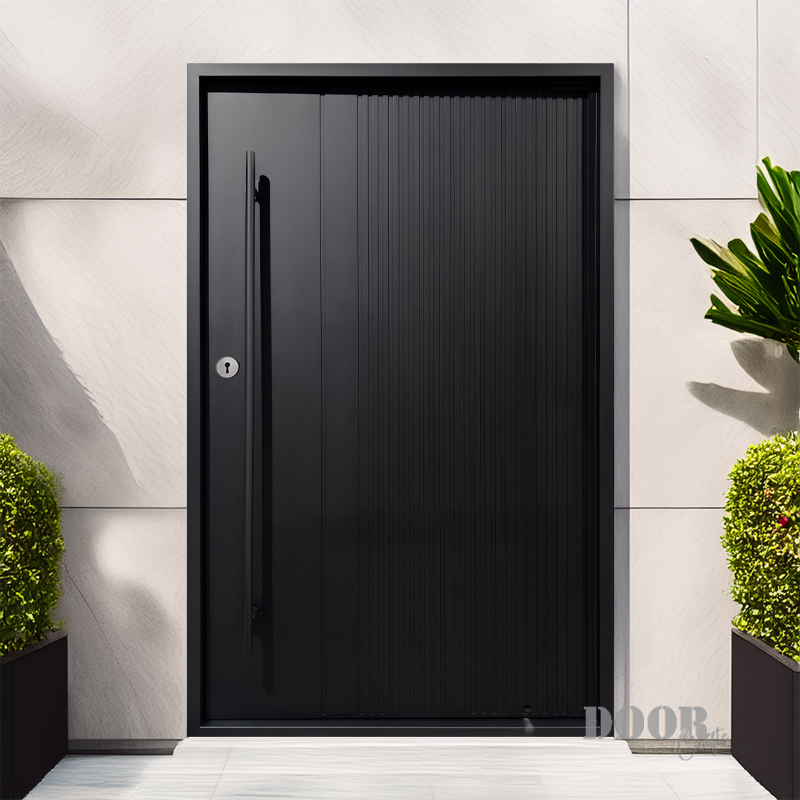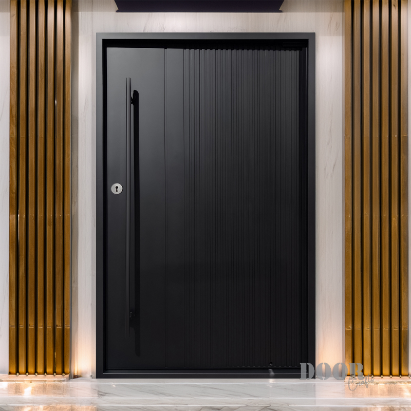 The Chevron pivot door showcases a sleek flat black finish detailed with vertical recessed lines that create a subtle, rhythmic texture. This design brings refined depth and modern sophistication to a minimalist silhouette, making it an elegant focal point for contemporary interiors.