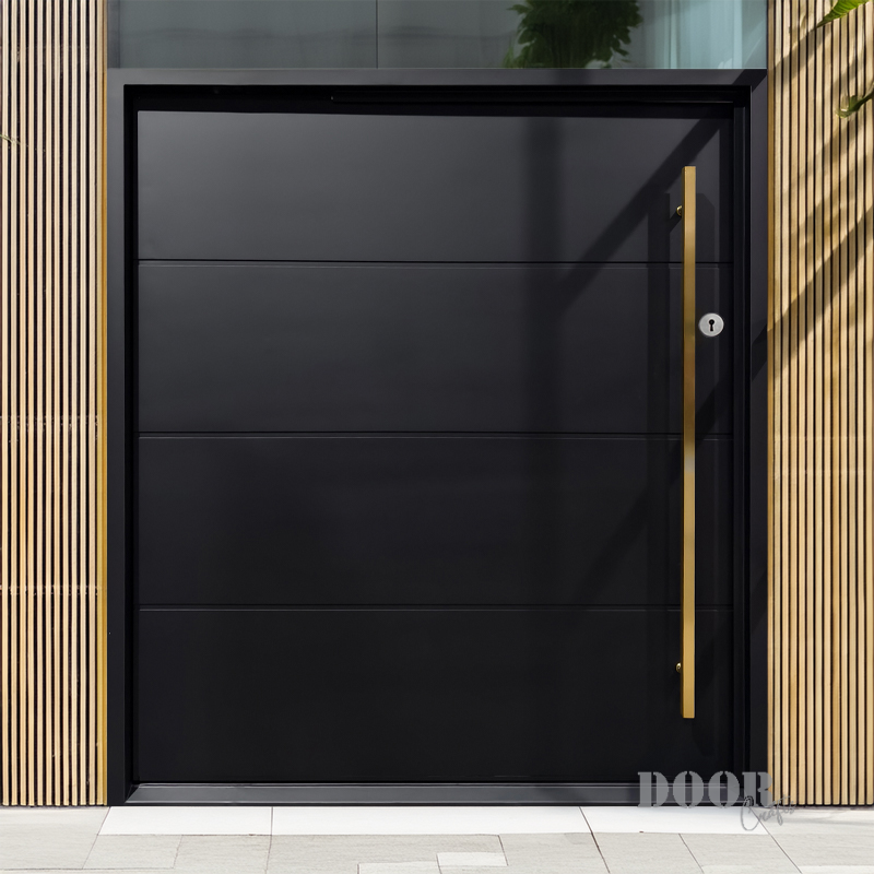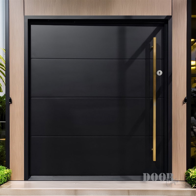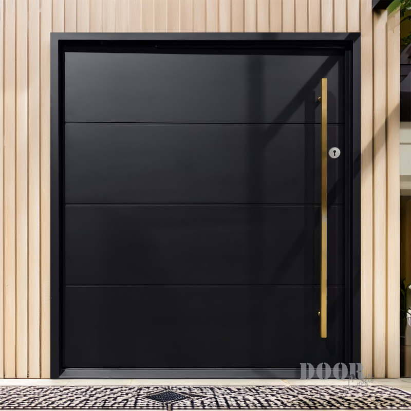 The Luxe combines understated elegance with bold accents, featuring four sleek panels separated by three clean horizontal recessed lines. A striking gold handle adds a touch of luxury and contrast, creating a sophisticated pivot door that elevates any modern entryway with timeless style.
