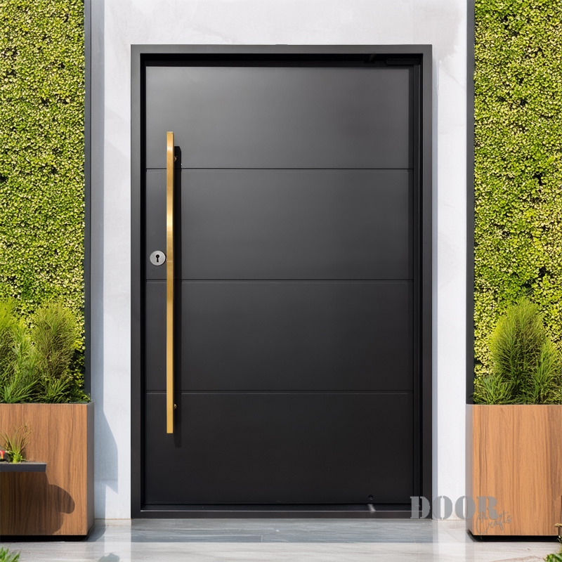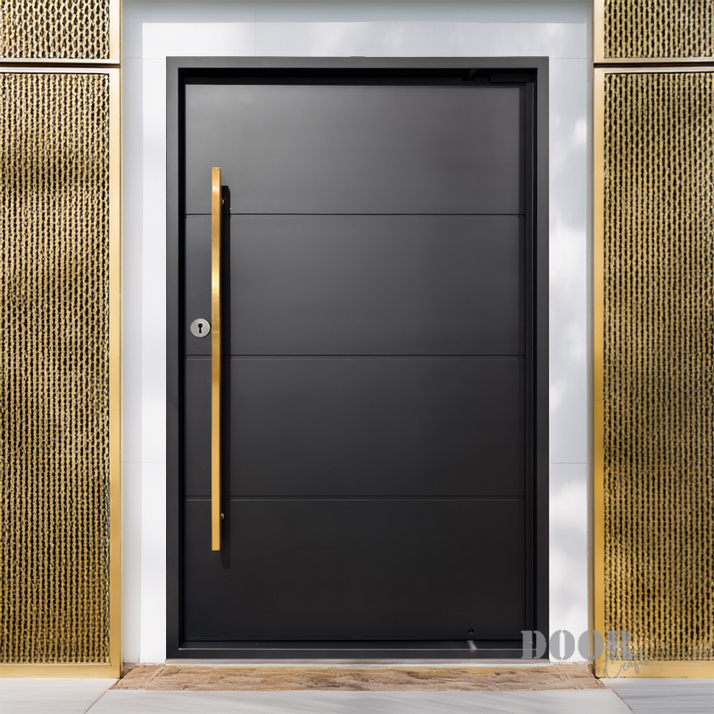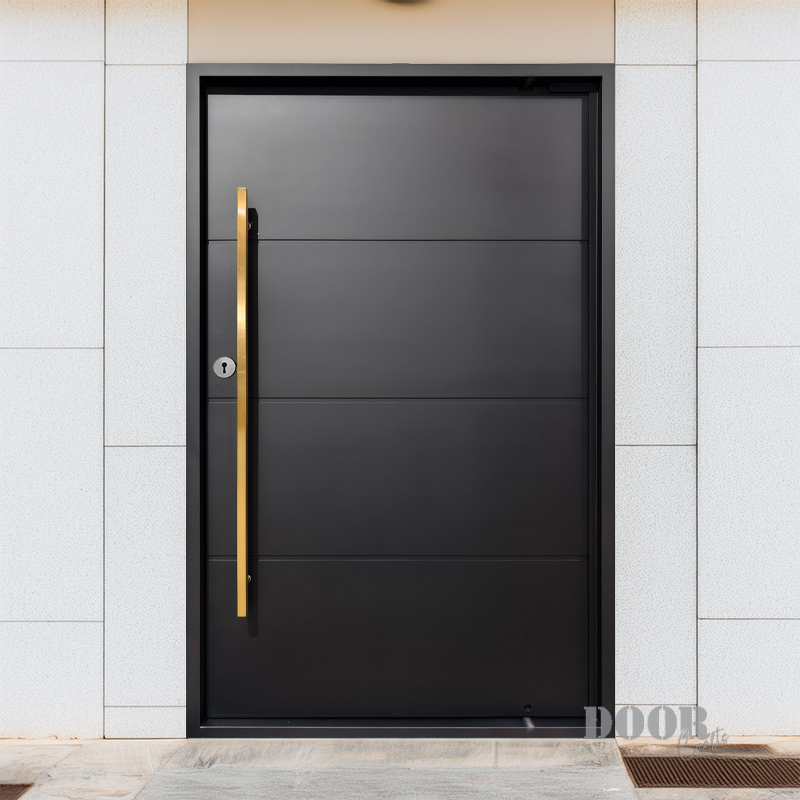 The Luxe combines understated elegance with bold accents, featuring four sleek panels separated by three clean horizontal recessed lines. A striking gold handle adds a touch of luxury and contrast, creating a sophisticated pivot door that elevates any modern entryway with timeless style.