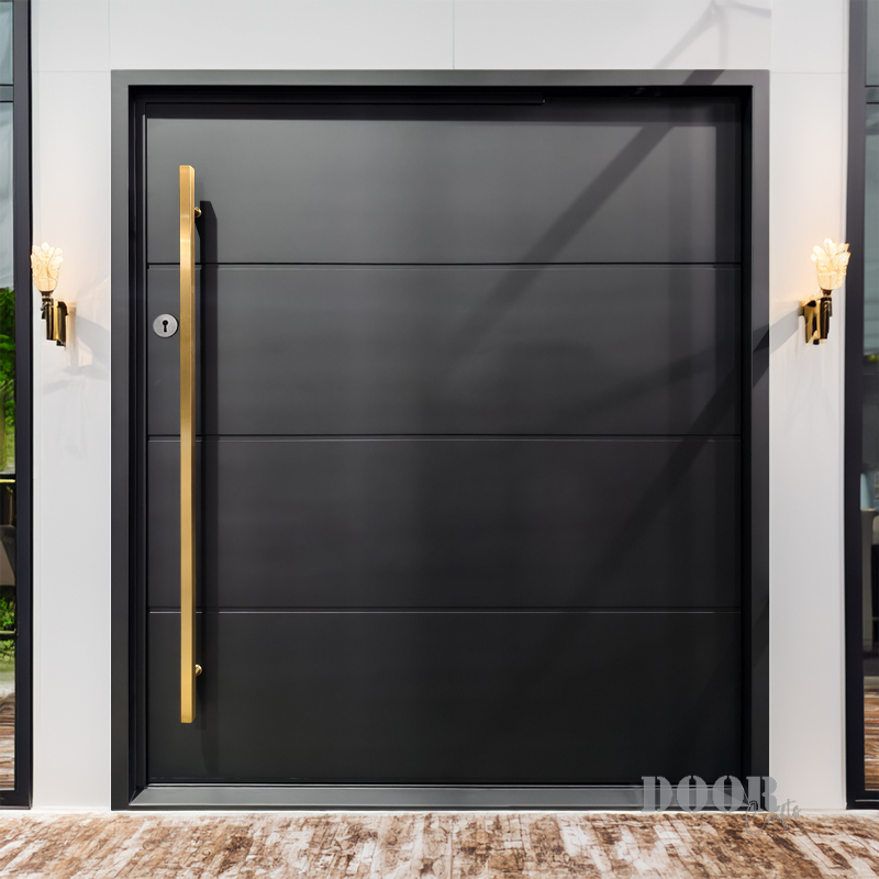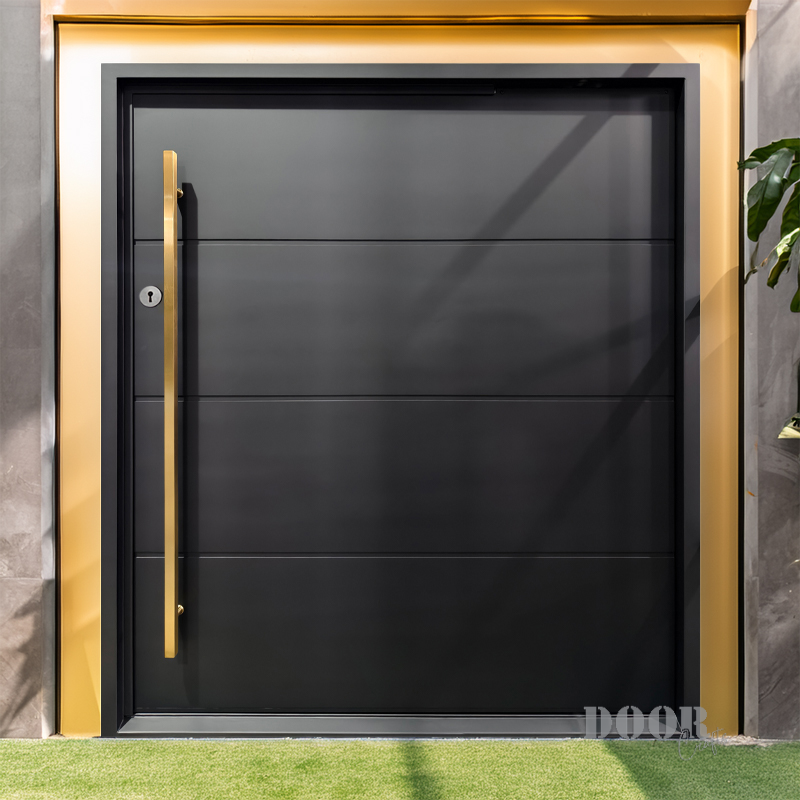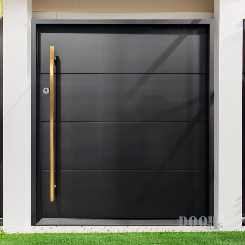 The Luxe combines understated elegance with bold accents, featuring four sleek panels separated by three clean horizontal recessed lines. A striking gold handle adds a touch of luxury and contrast, creating a sophisticated pivot door that elevates any modern entryway with timeless style.