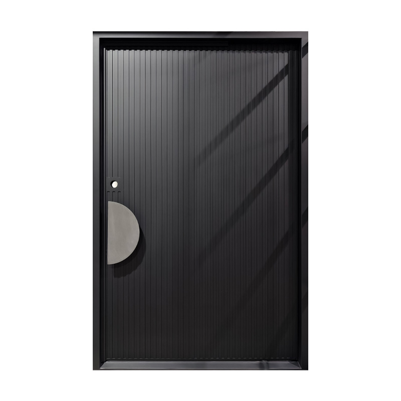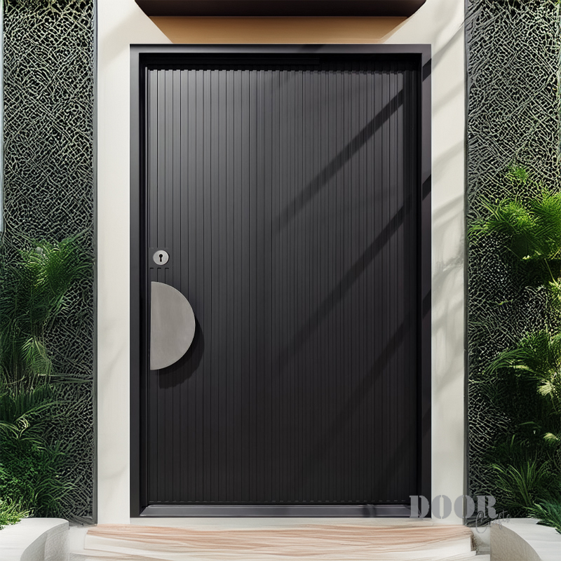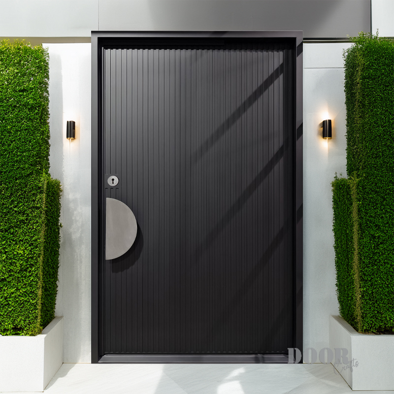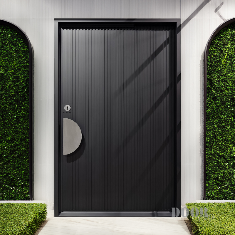The Meridian pivot door features sleek vertical recessed lines that create a strong sense of height and rhythm across its surface. Paired with a distinctive half-circle handle, the design balances linear precision with smooth, curved contrast. This door offers a modern, sculptural statement that enhances contemporary spaces with refined simplicity and bold detail.