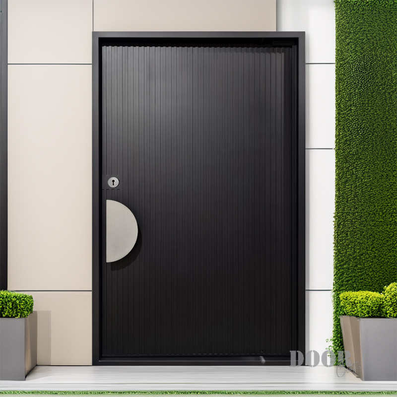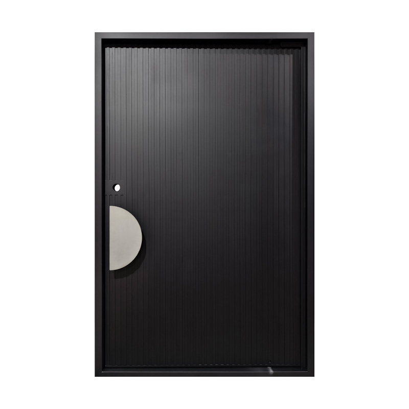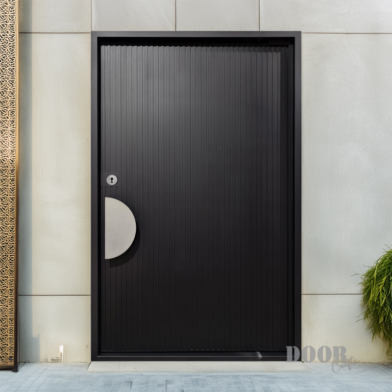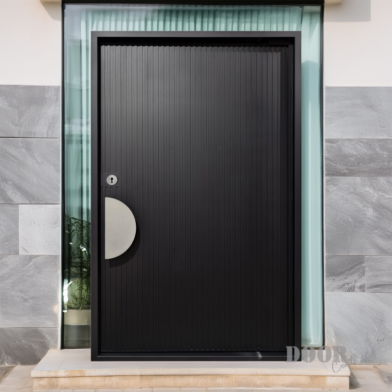 The Meridian pivot door features sleek vertical recessed lines that create a strong sense of height and rhythm across its surface. Paired with a distinctive half-circle handle, the design balances linear precision with smooth, curved contrast. This door offers a modern, sculptural statement that enhances contemporary spaces with refined simplicity and bold detail.