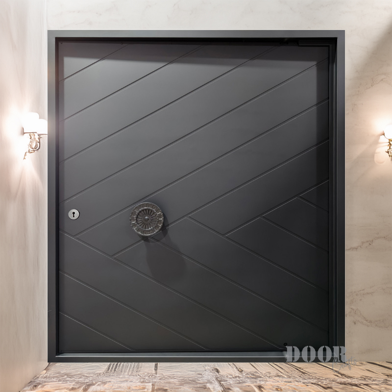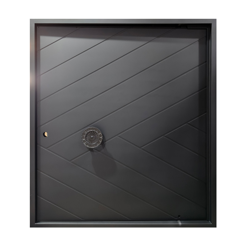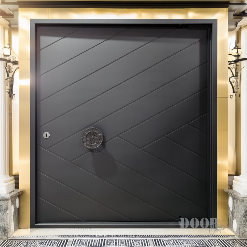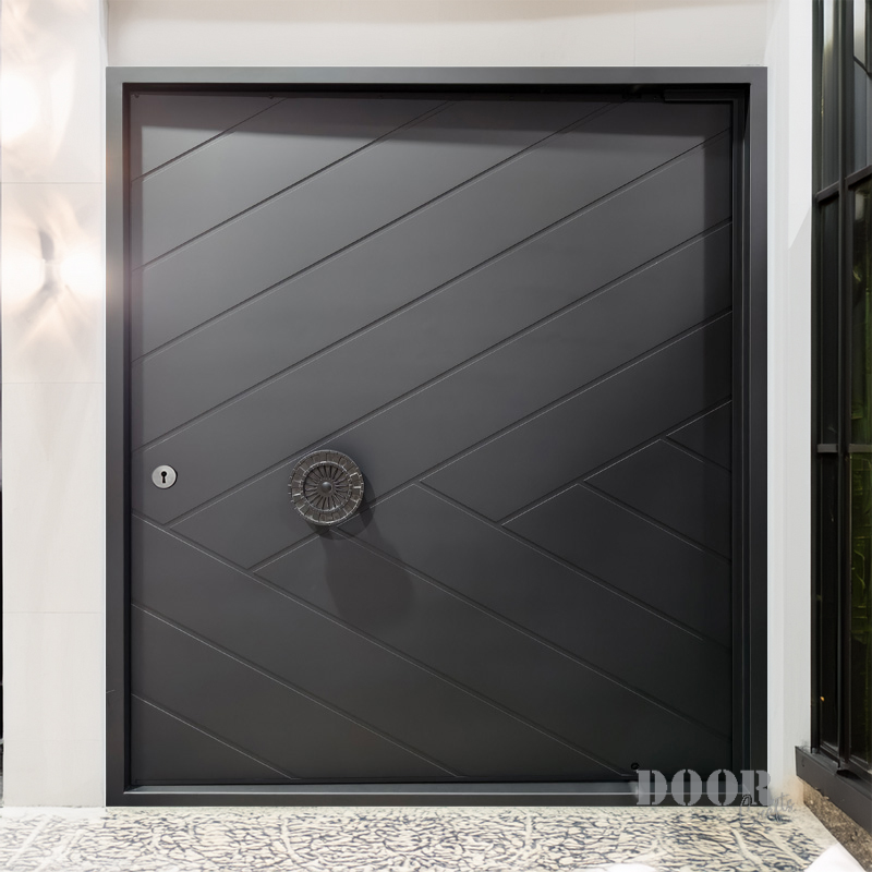 The Aztec pivot door features a pattern of intersecting lines that create a dynamic geometric texture across its surface. Its standout element is a prominent circular handle adorned with detailed Mesoamerican motifs, blending cultural heritage with modern design. This door offers a unique fusion of historic symbolism and contemporary craftsmanship, making it a striking centerpiece for any architectural space.