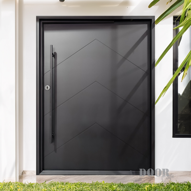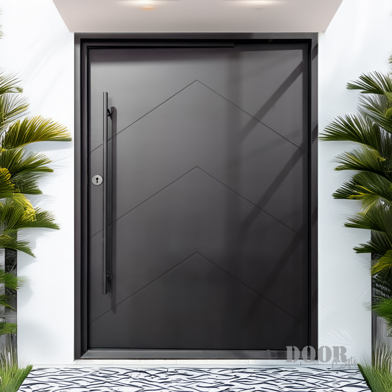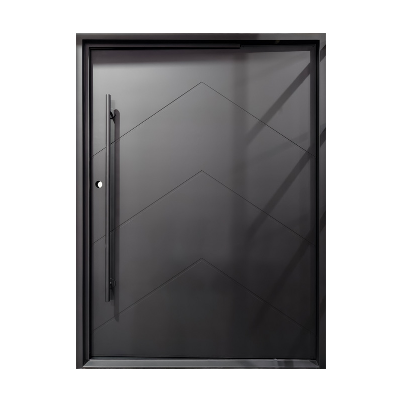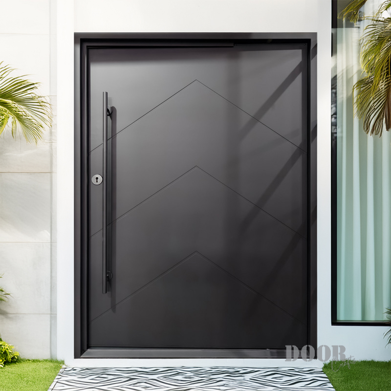 The Apex pivot door features three evenly spaced, inverted V-shaped forms that create a striking, arrow-like rhythm from top to bottom. Each recessed detail defines a separate panel, guiding the eye upward and reinforcing a sense of movement and direction. Bold and architectural, The Apex makes a sharp, modern statement with precision and intent.