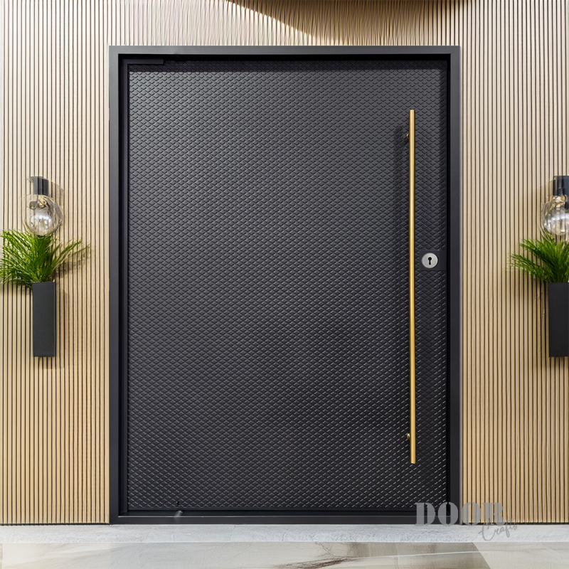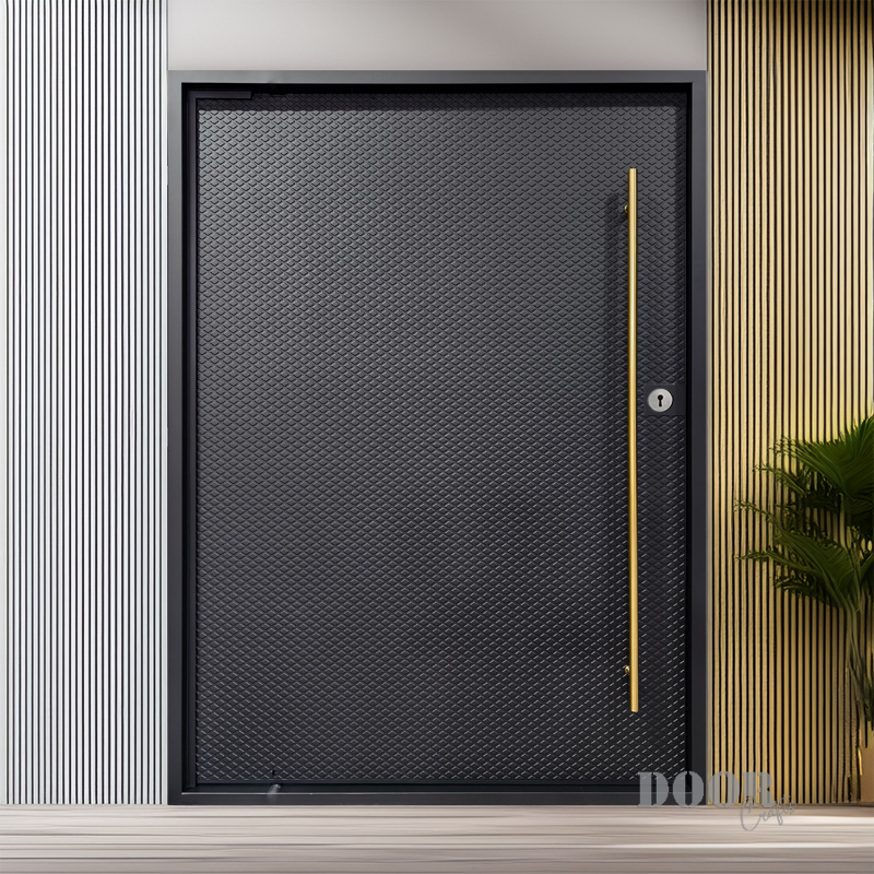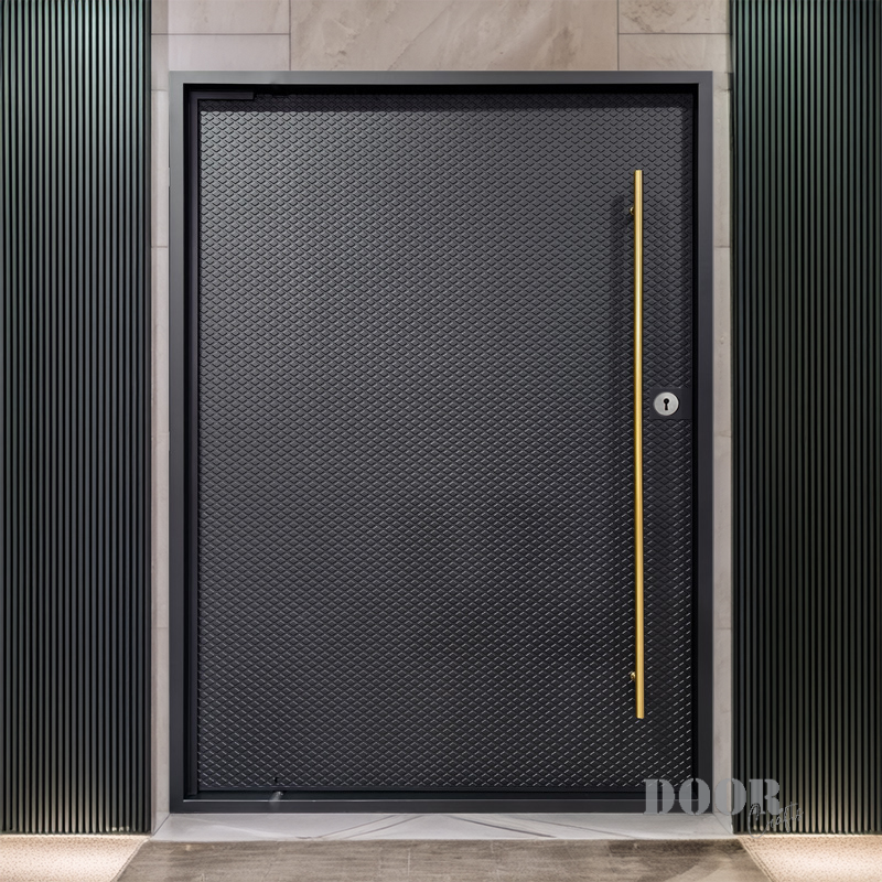 The Citadel pivot door is built for unmatched strength and presence, featuring a dense square grid pattern across an exceptionally thick and fortified structure. A bold gold handle adds a refined contrast to the door’s heavy, geometric surface, blending luxury with resilience. Designed to convey security and permanence, The Citadel stands as a modern architectural barrier — immovable, commanding, and unmistakably powerful.