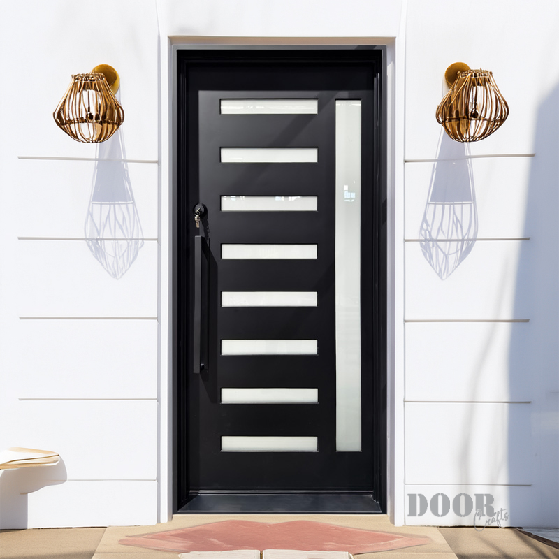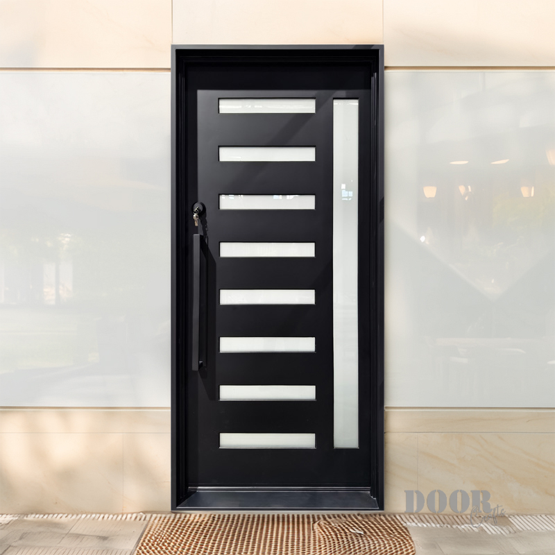 Metal doors look very unique and stylish when adorned with glass. These doors enhance the beauty and security of your space. Glass is crafted both horizontally and vertically to give your entryway a decent and unique appearance. Including handle, pre installed deadbolt, and sales tax.